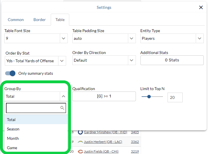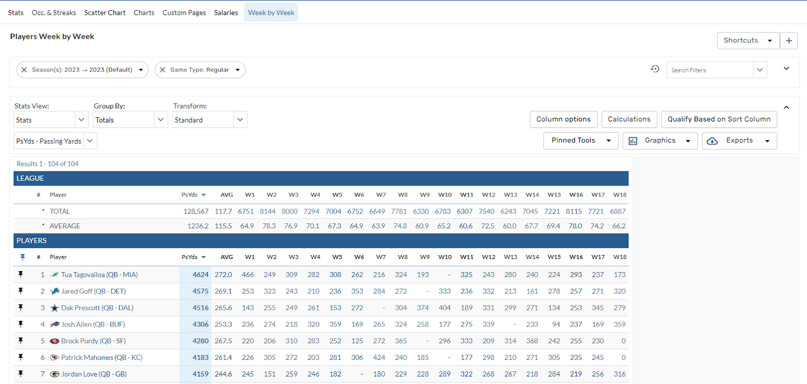 A new page with a week by week table has been added on teams and players sortables. Users can select a single stat in the dropdown to analyze seasonal trends.